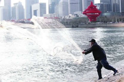 此时,岸边早已聚集了众多市民围观。“有时候看见岸边有这么多人的看,都觉得自己像是在表演捕鱼。”张师傅笑着说。还没等张师傅完全将鱼拖到岸上,就有不少市民手里拿着钱准备购买。“刚捕上来的鱼,大家快来买啊。”张师傅边吆喝着边将网里的大小鱼分开,不一会网里的鱼就被抢购一空。“这一网挣了将近200元,收获还不错。”张师傅笑着说。