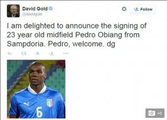 在奥比昂签约不久,西汉姆主席大卫-高德就代表俱乐部高调地发推:“我非常高兴地宣布23岁中场大将佩德罗-奥比昂从桑普多利亚转会而来。佩德罗,欢迎你!”这一推特并无特别之处,但问题在于,高德在文后竟配了一张尤文图斯中卫奥邦纳的图……
