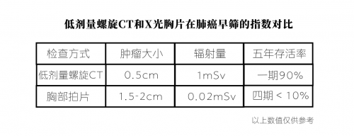 肺部结节一般要大到1.5-2cm,才可能在胸片中显现出来,而且有些特殊的结节在影像上仅仅表现为斑片状或磨砂玻璃影,通过胸片检查根本发现不了。而直径约0.5cm的肺部肿瘤都可通过低螺旋剂量CT清晰检测成像,其肺癌诊出率约为胸片的10倍。