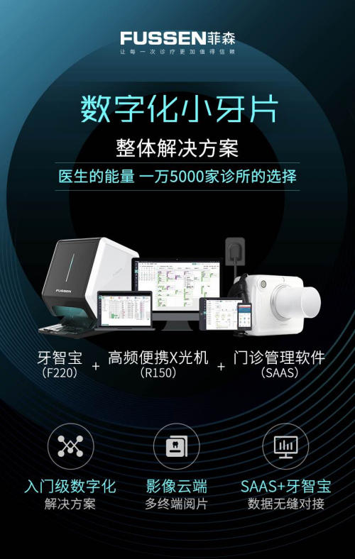 通过其牙智宝+SAAS+便携X光机,菲森打造了数字化小牙片解决方案。实现了影像数据的无缝对接,也成为口腔诊所入门级的数字化解决方案。