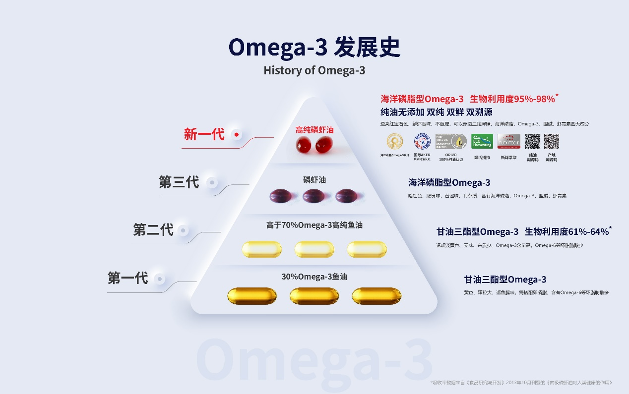 营养学会推荐人体每天补充约250~2000毫克Omega-3,日常食材不含Omega-3,传统的Omega-3补充剂例如鱼油等,在适口性、吸收率等方面急需升级,如何破局?营养专家们进退两难。近年来,他们在研究海洋生物的过程中,发现萃取自南极磷虾的磷虾油,富含自然界中唯一结合磷脂质的Omega-3,磷脂型Omega-3可以直接穿透细胞膜,生物利用吸收率在90%以上。而且磷虾油水油双亲,可以在消化系统中快速分解,服用45分钟即可被人体吸收。海洋磷脂型Omega-3吸收率、亲水性、活性都远高于鱼油,能够强效降低甘油三酯水平,更利于健康。磷虾油已日益受高端消费者青睐,成为鱼油的天然升级替代品。