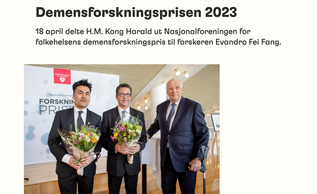 基于对阿尔茨海默症和抗衰老的药物研发研究新突破,Prof. Evandro Fei Fang在2023 年荣获由挪威国王哈拉尔五世亲自颁发的“挪威公共卫生协会阿尔兹海默症研究奖”,以表彰其在阿尔茨海默症的预防研究和营养创新领域做出的卓越贡献。作为奥斯陆大学(UiO) 和挪威Akershus大学医院的教授,其还曾荣获Butler-Williams 老龄化学者奖(美国)、2020 年自然科学青年科学家科学奖(挪威)等奖项。