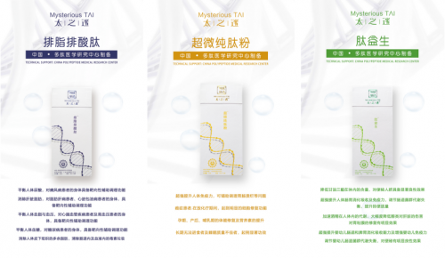 我们目前主推的“人人泰”全系肽产品以功效型食品、化妆品为主,以世界顶尖的肽固相合成技术制备工艺,实现与人体细胞99.9999%的匹配度,人体细胞吸收率达100%,是目前唯一用于靶向辅助调理口服、食用与保健的科研成果转化产品,可提升人体免疫力,辅助肠胃调理,对放化疗的癌症患者有一定的细胞修复作用,对术后、产后、哺乳期的体能修复及营养提升大有裨益,同时对饮食不规律、睡眠质量差的人群有显著疗效。此外,像超微纯肽粉、排脂排酸纯肽粉、纯肽粉+益生菌等纯肽口服系列产品也都经过了国家相关权威部门认证,对不同体质人群的人体细胞靶向性修复调理均有奇效。此外,我们还有以“太之迷”为代表的纯肽系列护肤产品,可用于受损细胞修复、增加新生优质细胞留存、加快细胞新陈代谢,在消除炎症、痤疮、痘痘等不良皮肤问题,减少色素沉积,促进胶原蛋白合成、增加皮肤弹性等方面有良好效果。